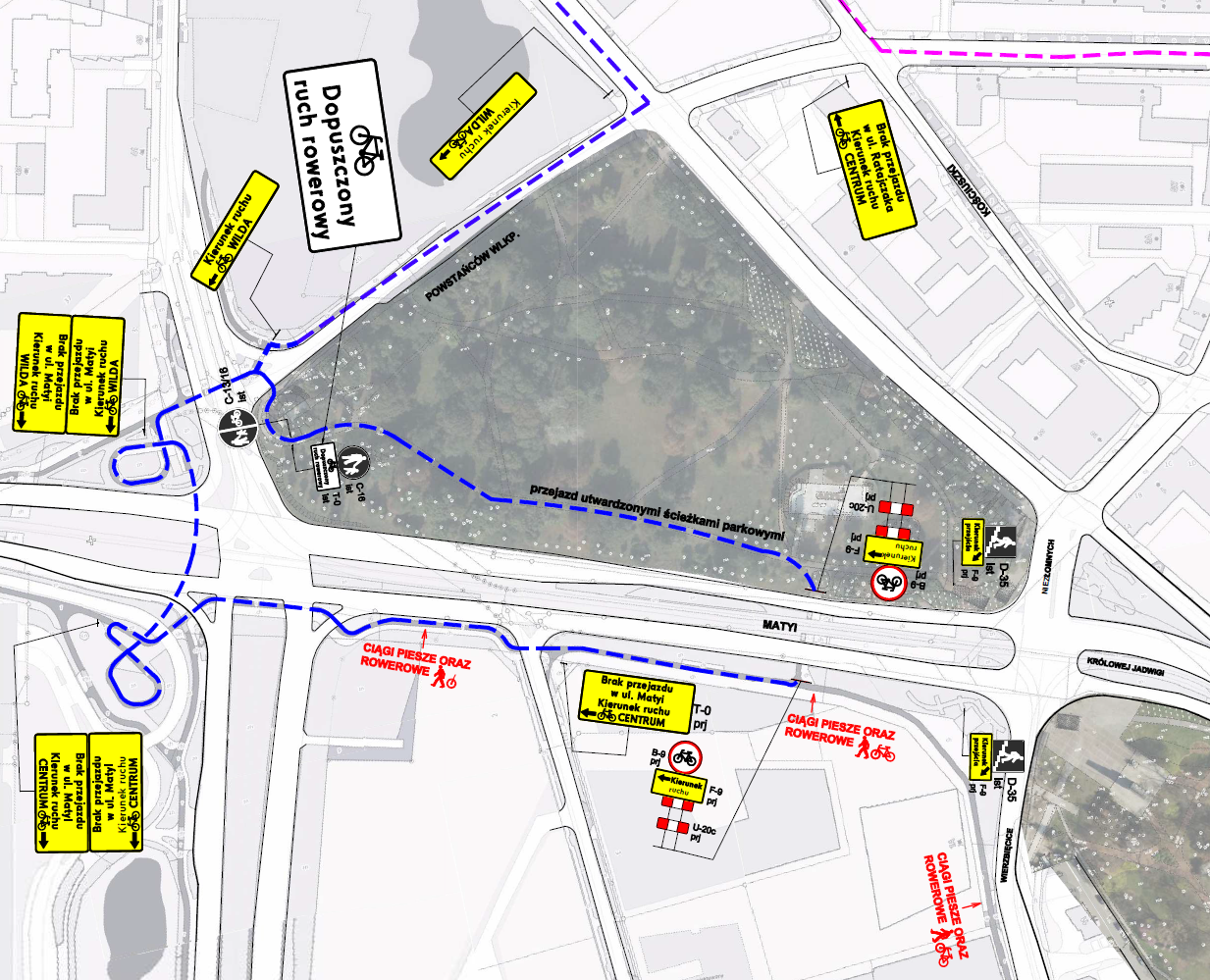 Poznańskie Inwestycje Miejskie informują o wprowadzeniu zmian również w organizacji ruchu dla pieszych i rowerzystów. Dopuszczony został ruch rowerowy przez utwardzoną południową alejkę w Parku Marcinkowskiego. Ruch pieszych poprowadzony został Park Marcinkowskiego i Park Drwęskich.